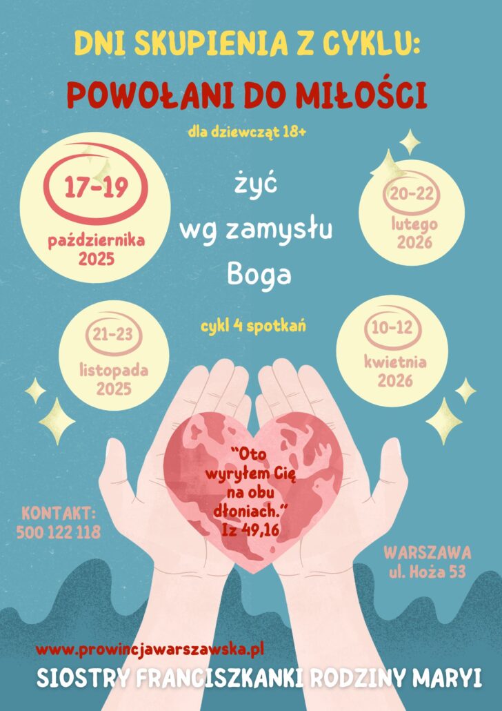 Będzie to pierwsze z propozycji czterech spotkań skupieniowych z cyklu POWOŁANI DO MIŁOŚCI – ŻYĆ WG ZAMYSŁU BOGA. Spotkania tworzą jedną całość, ale są odrębne więc jeśli nie jesteś w stanie wziąć udziału w całym cyklu – nic nie szkodzi. Możesz przyjechać na pojedyncze wydarzenia, których daty widnieją na plakacie 🙂 Oczywiście zachęcamy do skorzystania z całego zaproponowanego cyklu skupieniowego 🙂