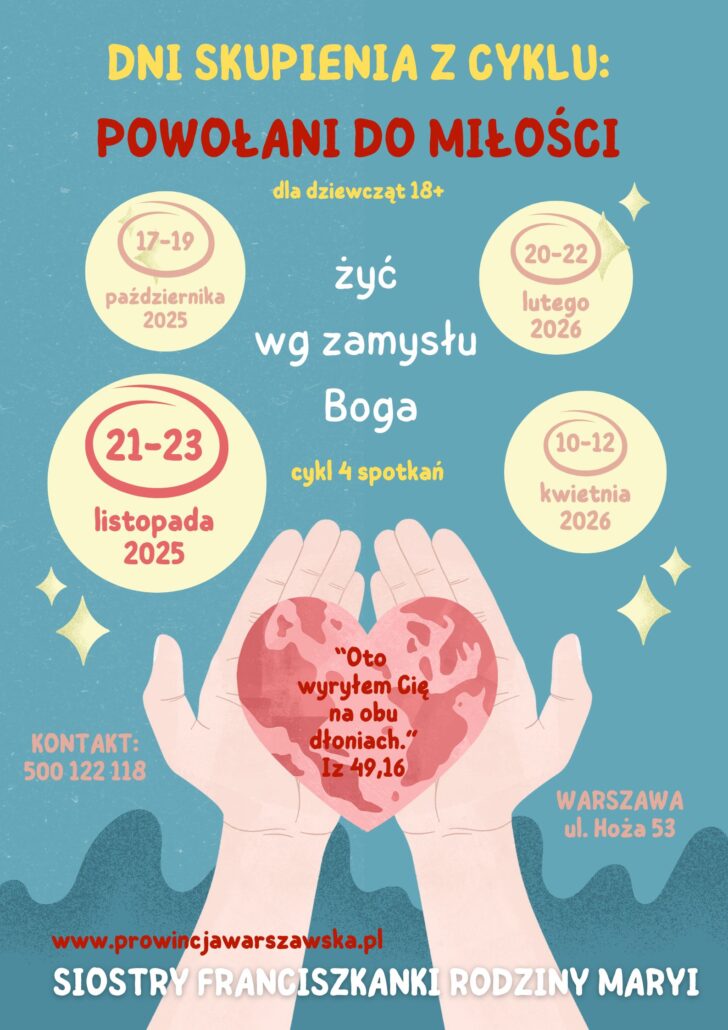 Będzie to już drugie z propozycji czterech spotkań skupieniowych z cyklu POWOŁANI DO MIŁOŚCI – ŻYĆ WG ZAMYSŁU BOGA. Spotkania tworzą jedną całość, ale są odrębne więc jeśli nie jesteś w stanie wziąć udziału w całym cyklu – nic nie szkodzi. Możesz przyjechać na pojedyncze wydarzenia, których daty widnieją na plakacie 🙂 Oczywiście zachęcamy do skorzystania z całego zaproponowanego cyklu skupieniowego 🙂